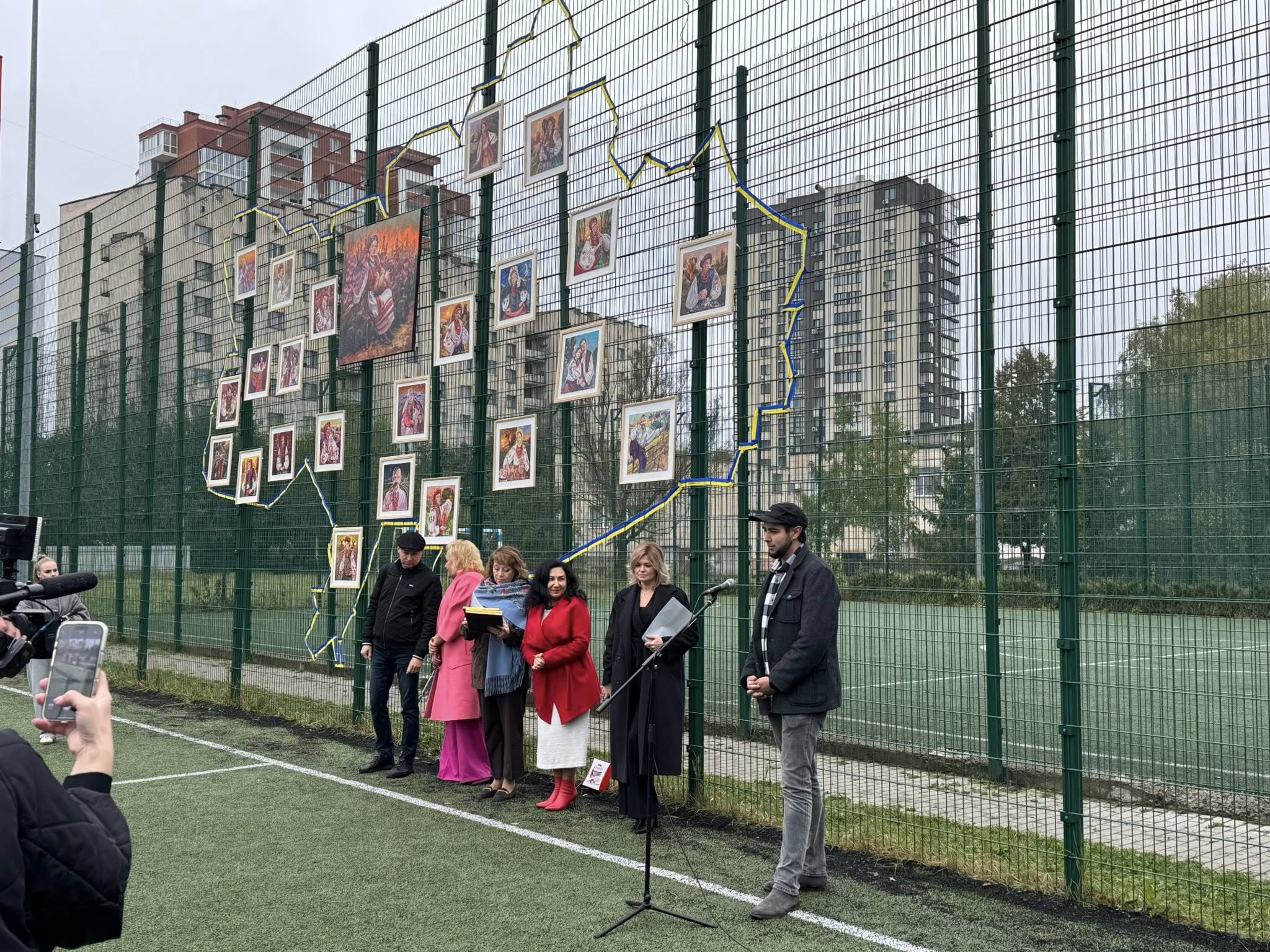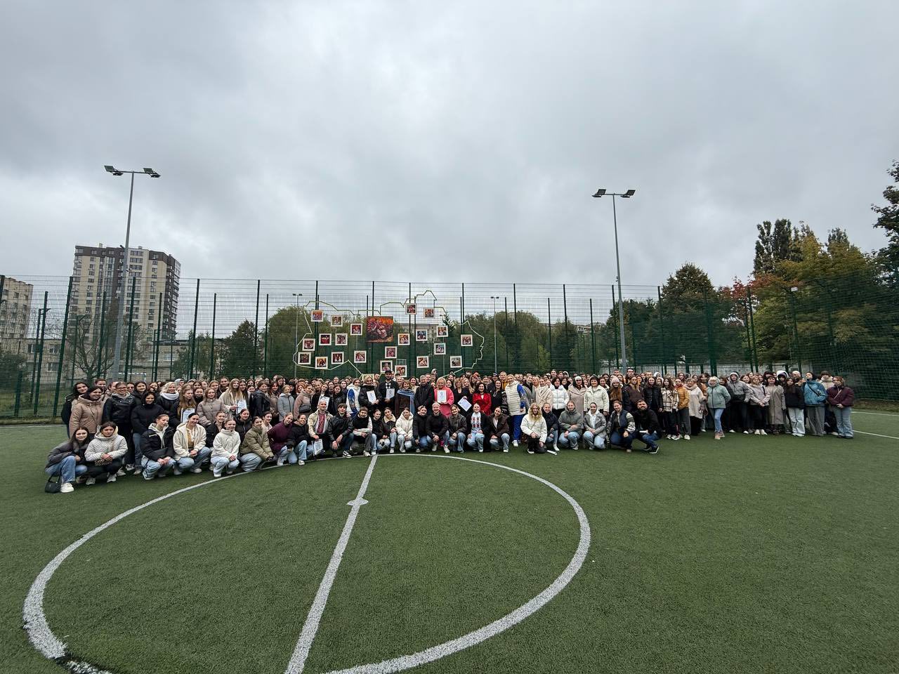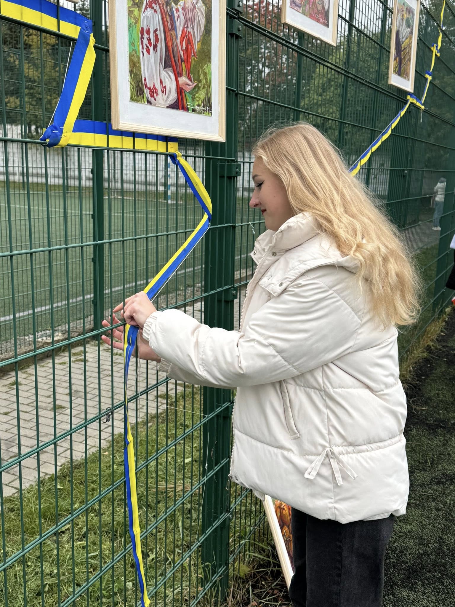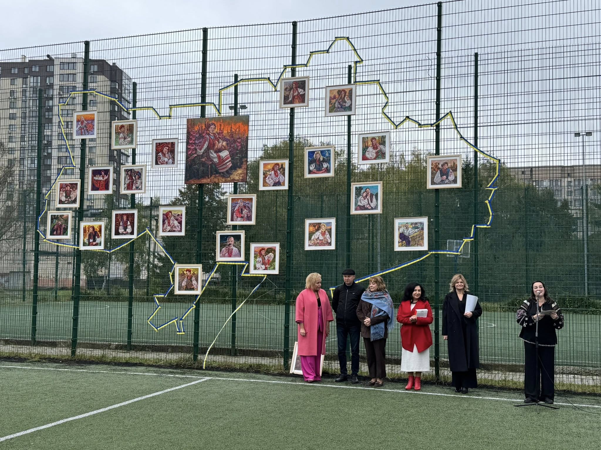 На сітчастій вертикальній основі контурно студенти трьох факультетів один за одним, почергово, позначили та зімкнули границі України, переплітаючи жовто-блакитну стрічку між отворами сітки, створивши таким чином візуал мапи країни.