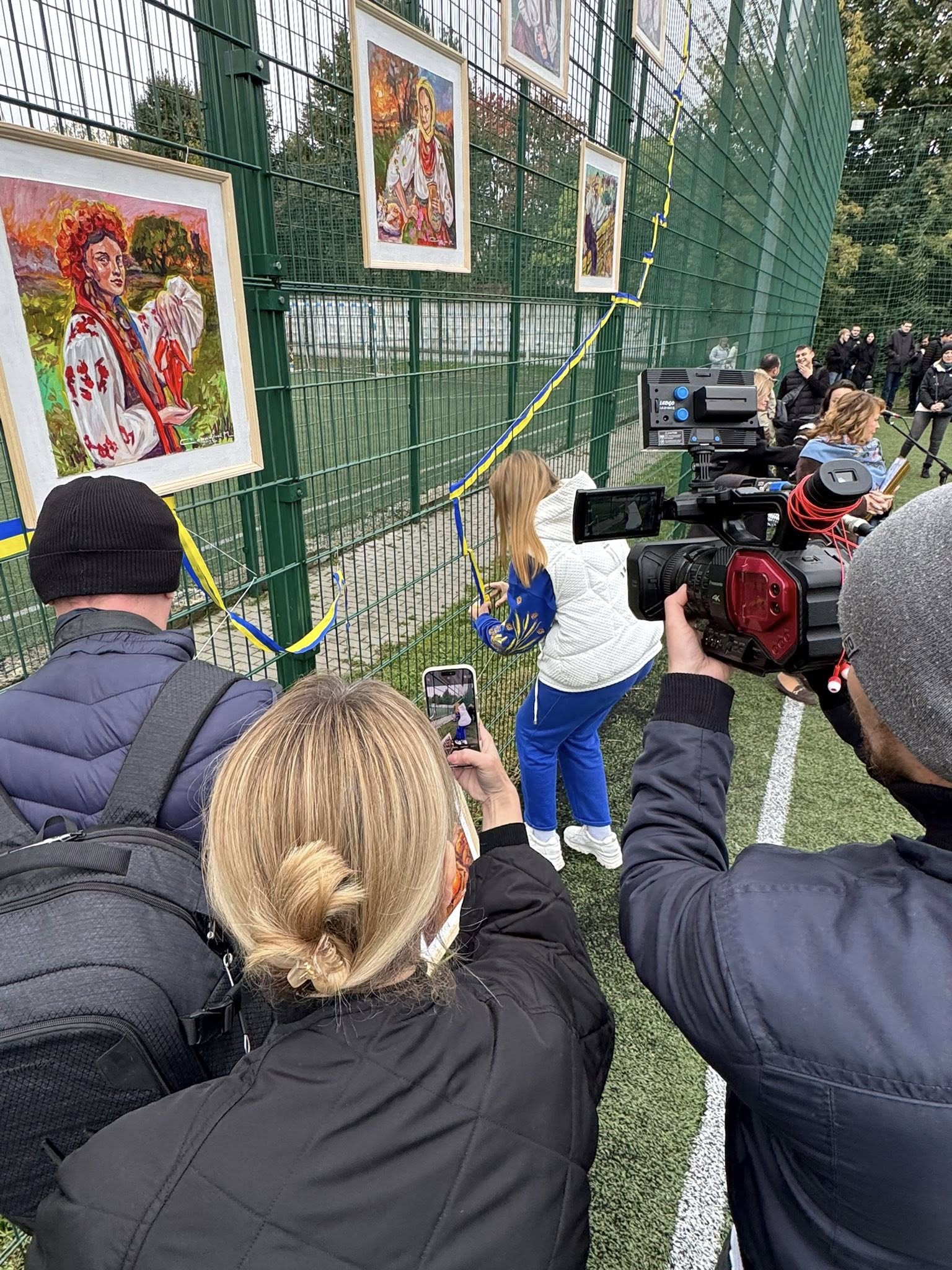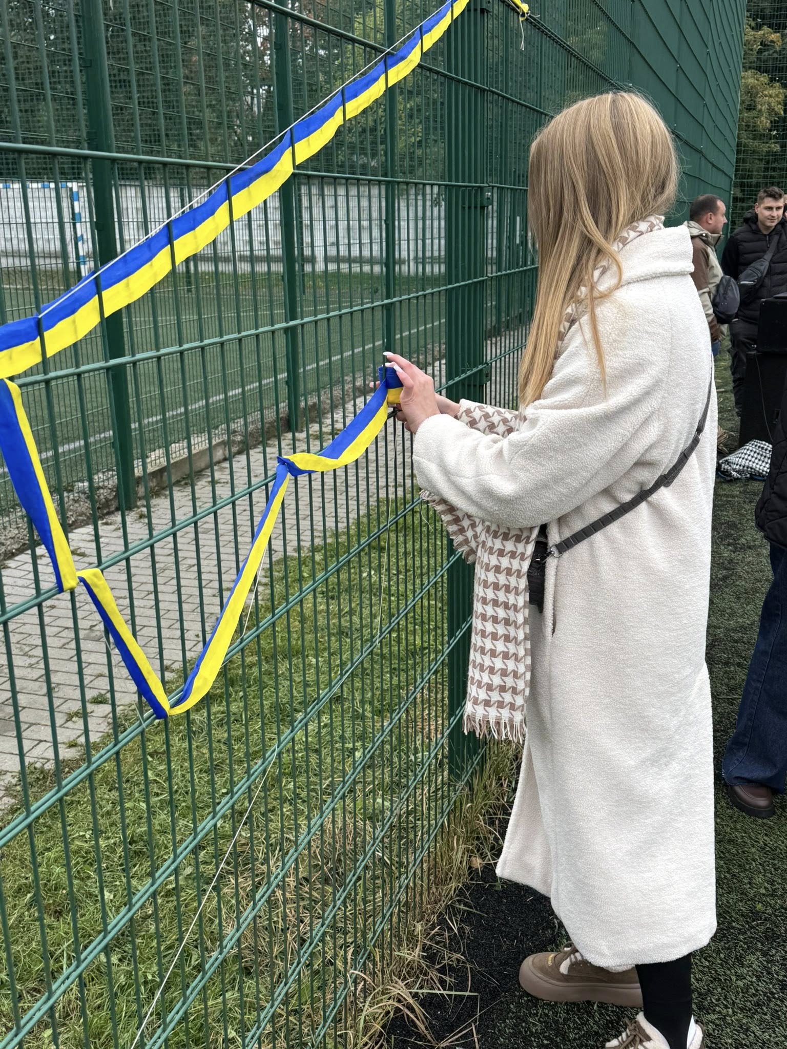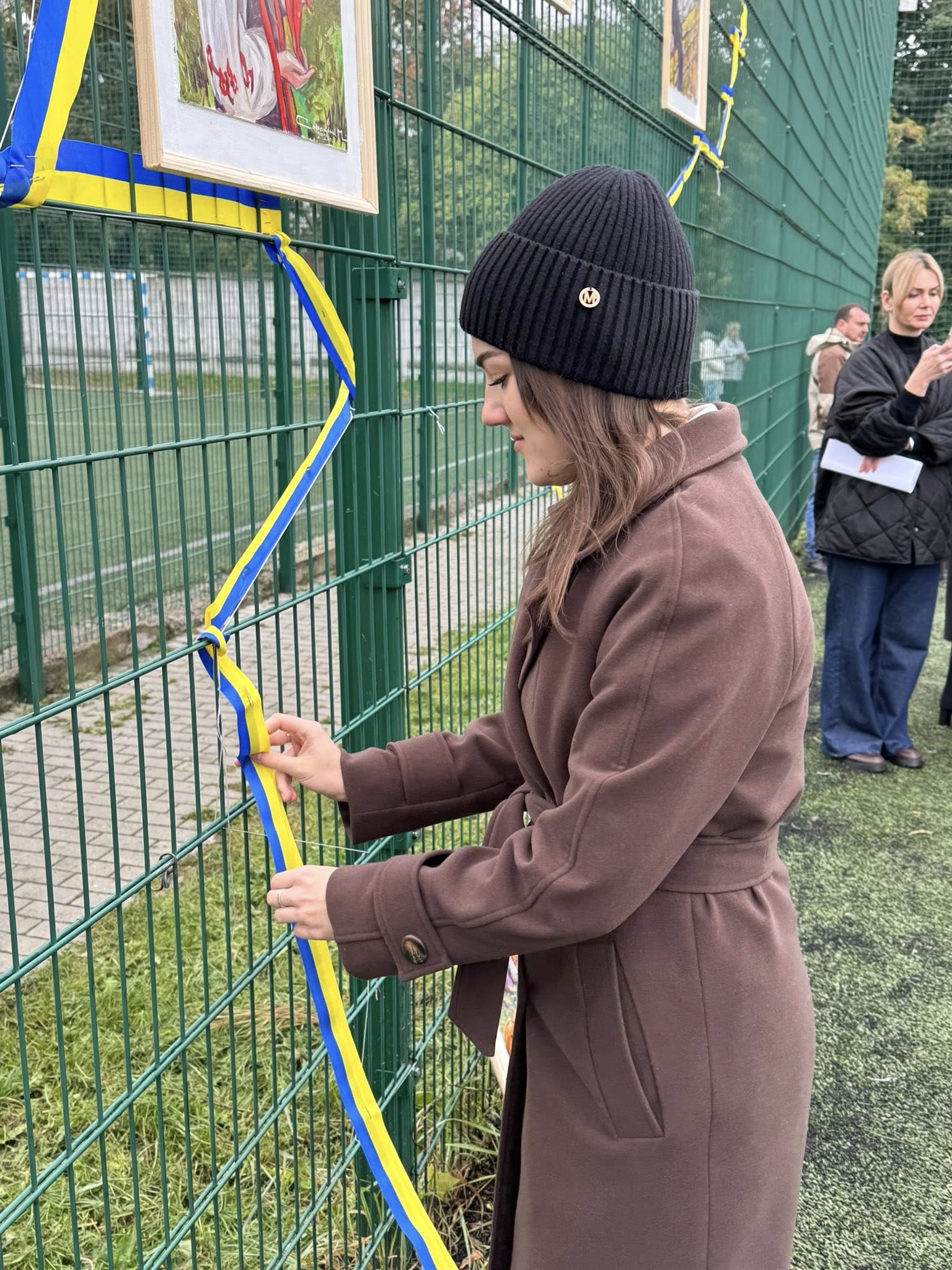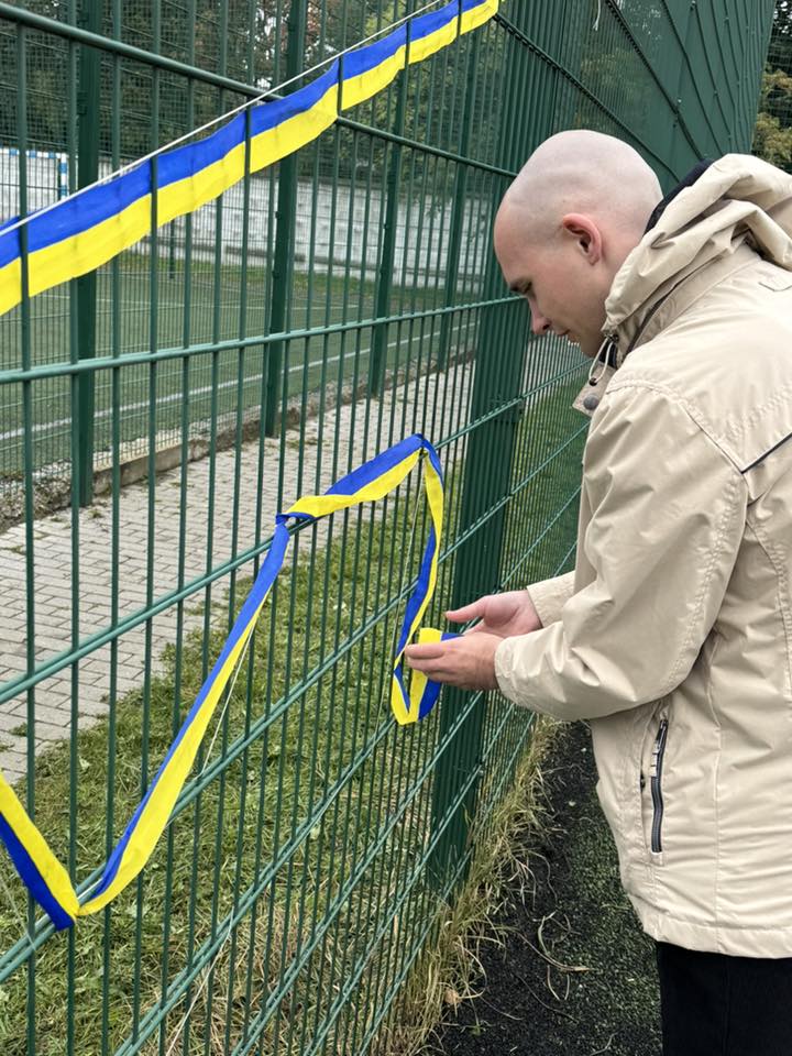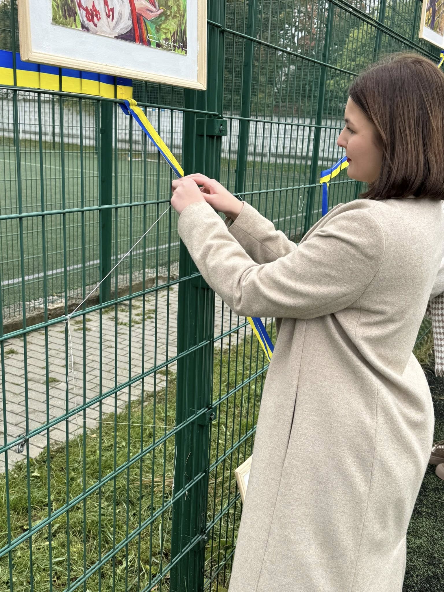 На сітчастій вертикальній основі контурно студенти трьох факультетів один за одним, почергово, позначили та зімкнули границі України, переплітаючи жовто-блакитну стрічку між отворами сітки, створивши таким чином візуал мапи країни.