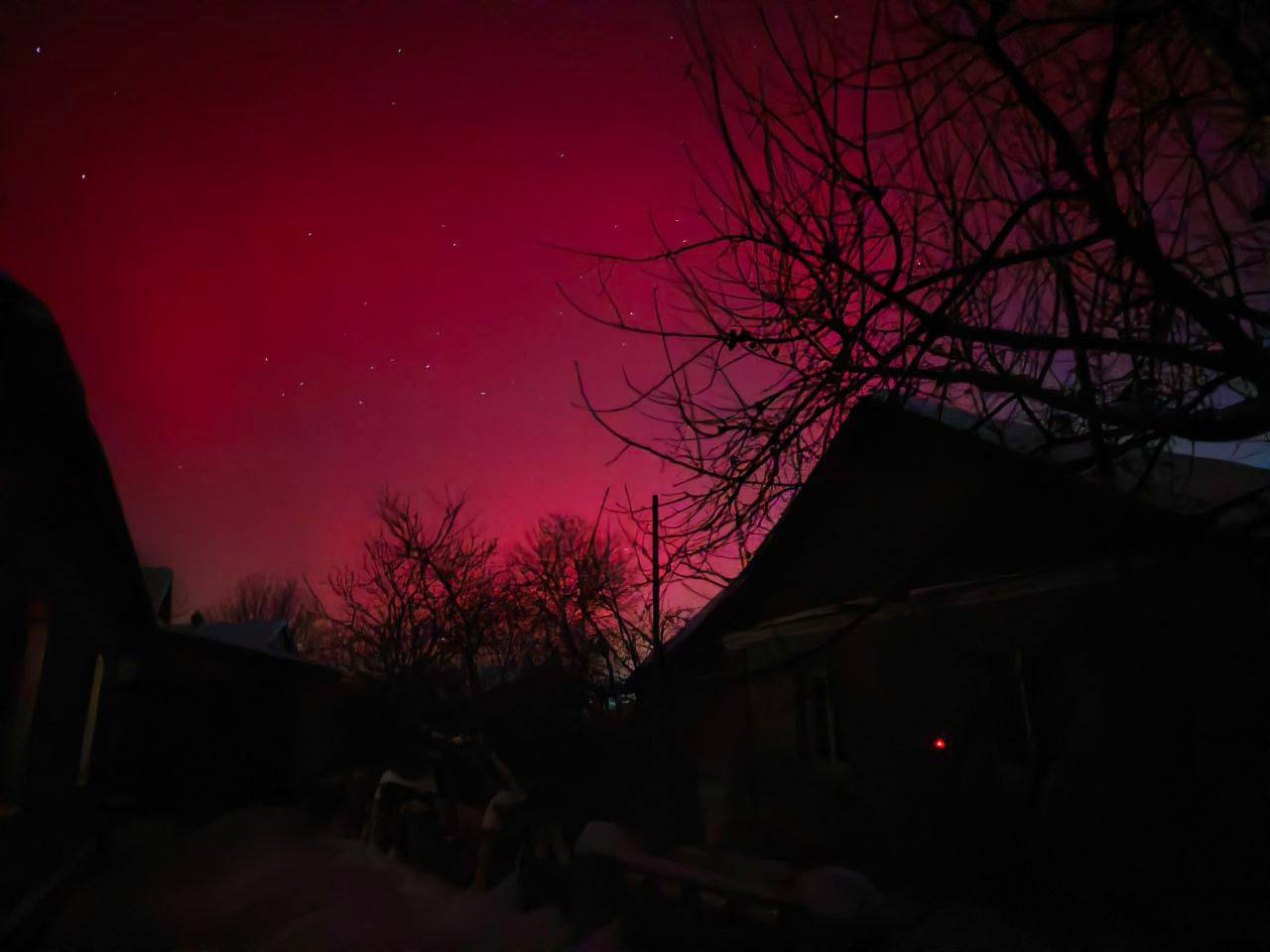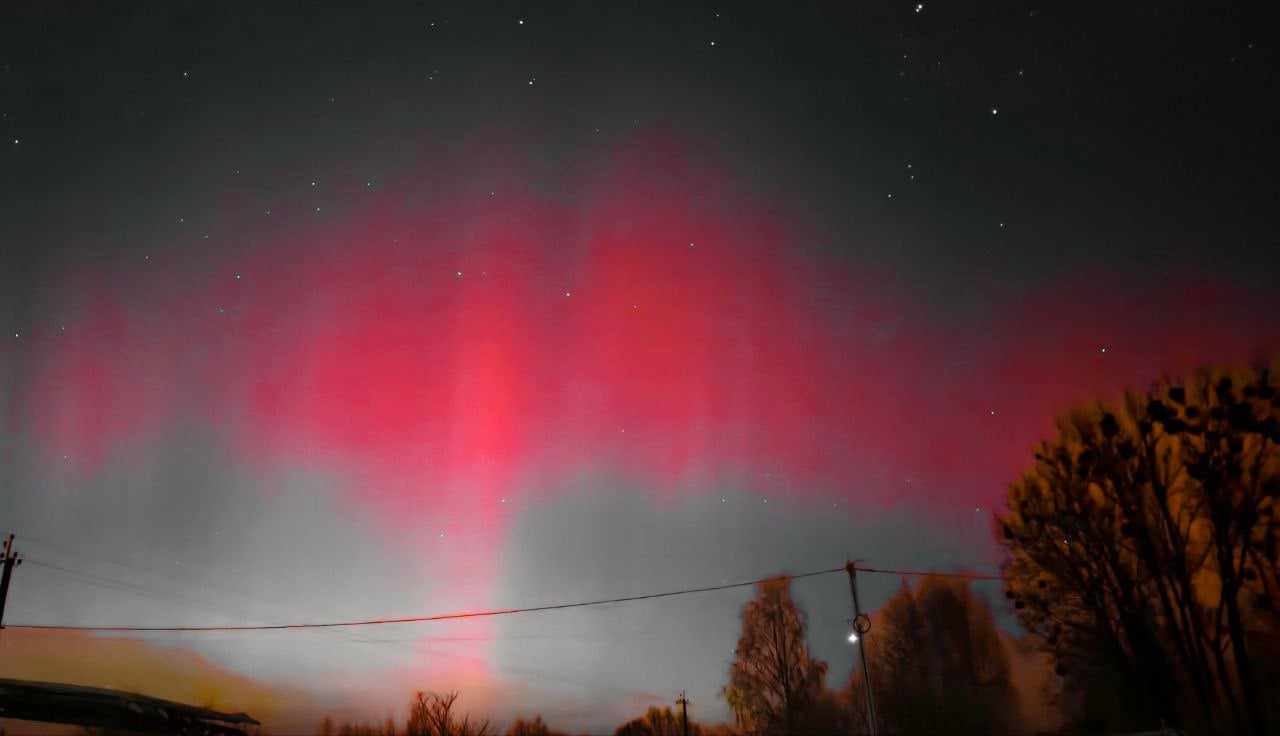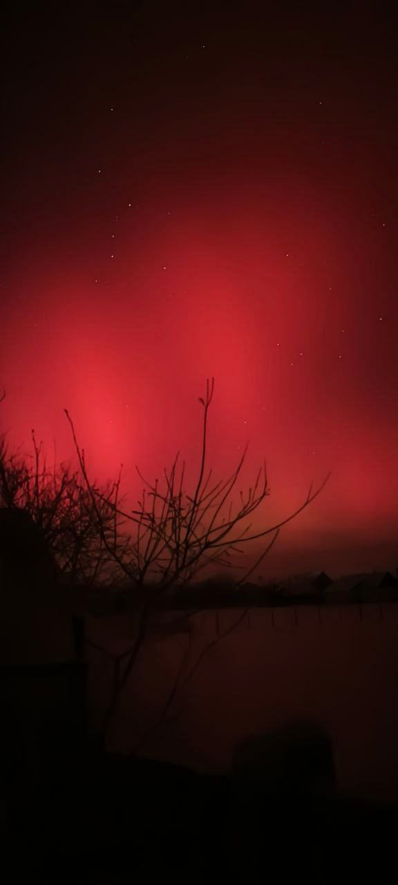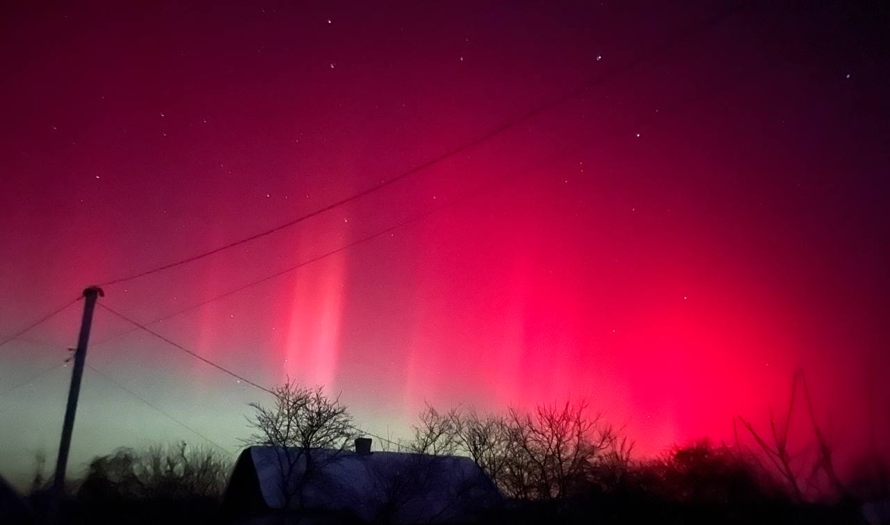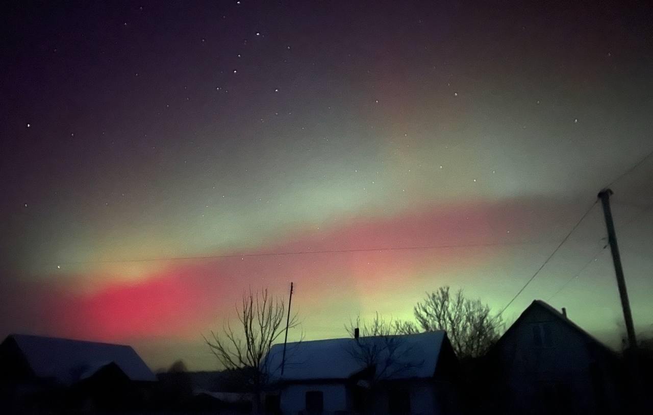 Довідка: Характерний для нашого регіону червонуватий та малиновий колір сяйва виникає через взаємодію сонячного вітру з киснем у верхніх шарах атмосфери (на висоті понад 200 км).