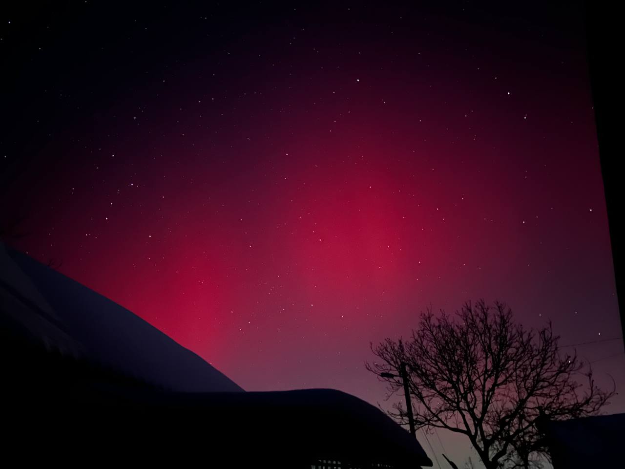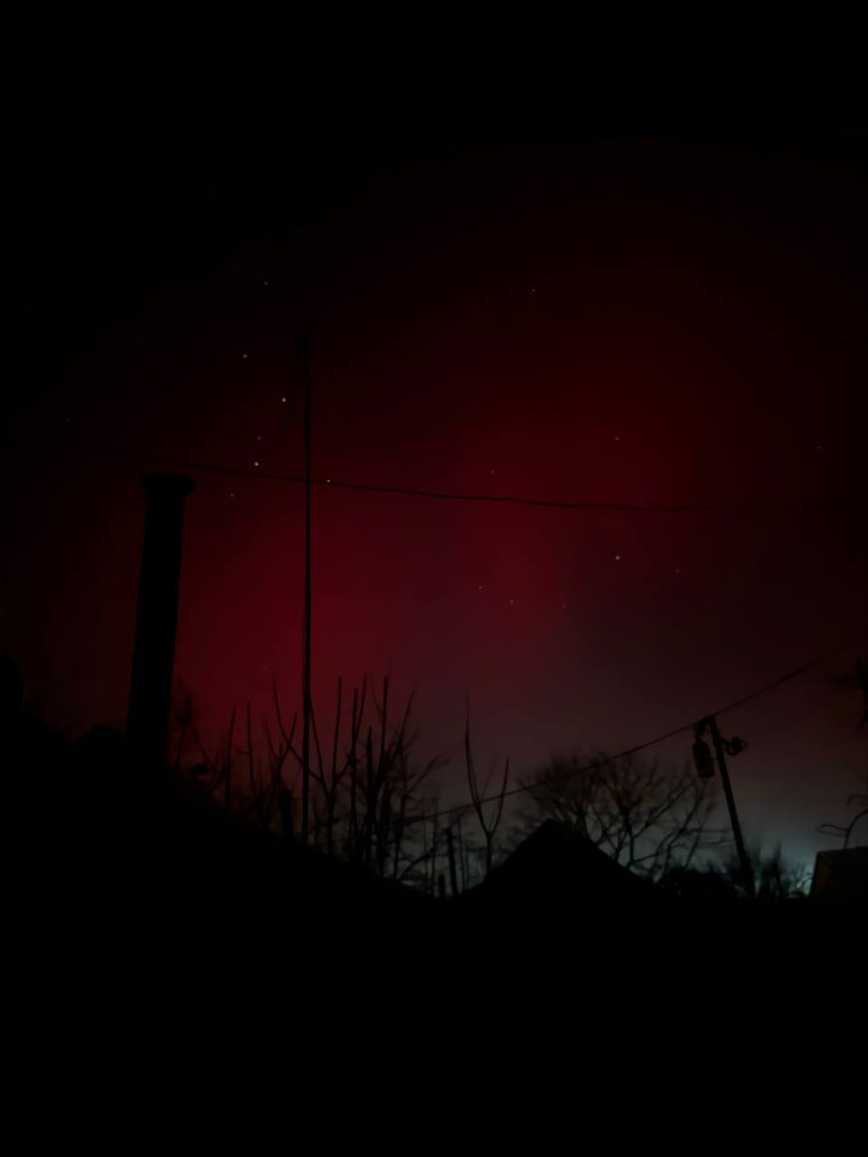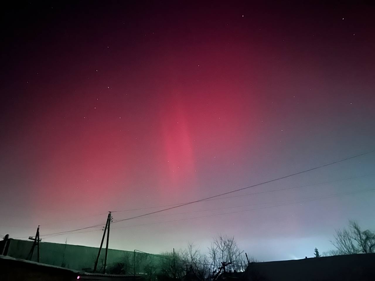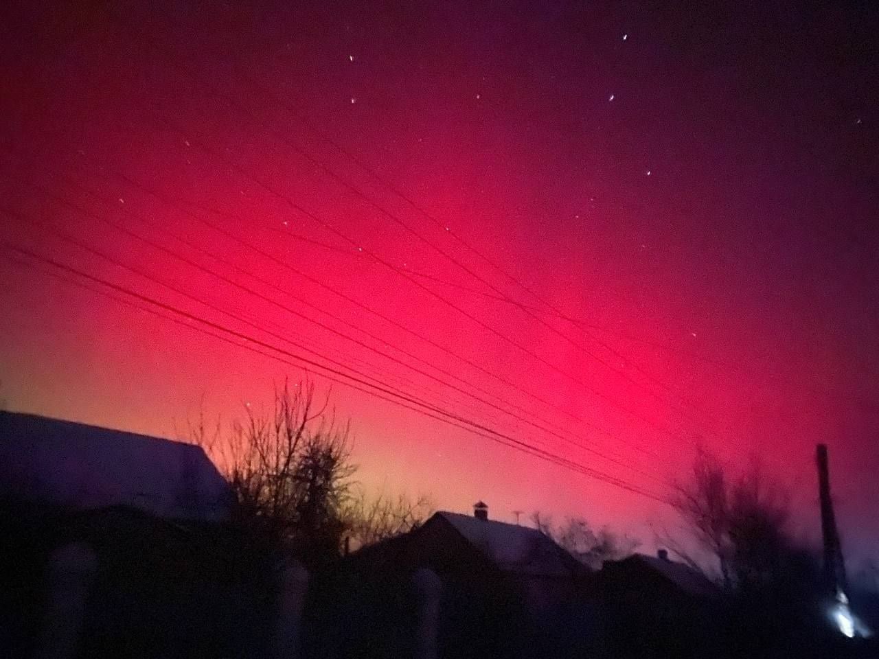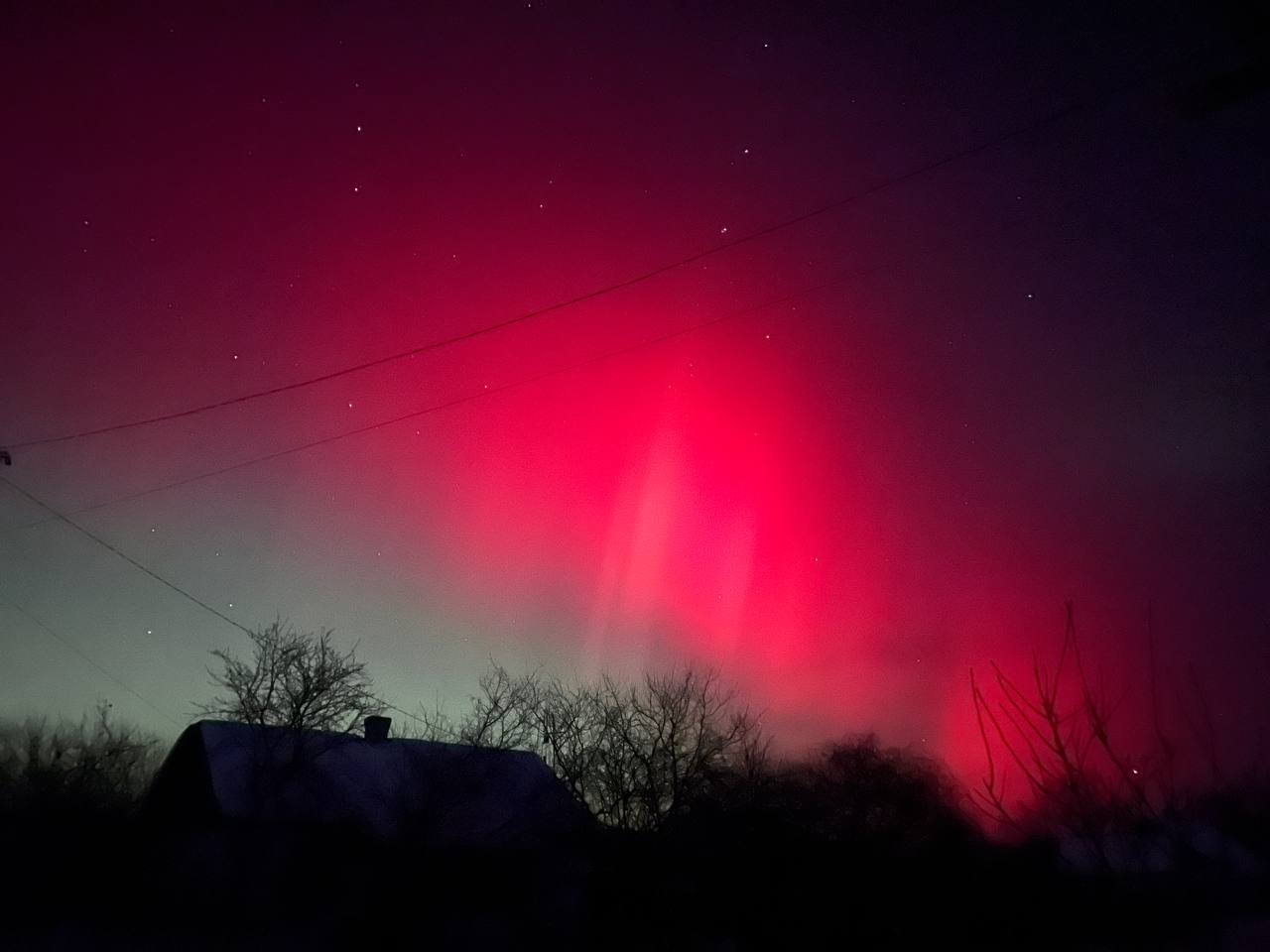 Довідка: Характерний для нашого регіону червонуватий та малиновий колір сяйва виникає через взаємодію сонячного вітру з киснем у верхніх шарах атмосфери (на висоті понад 200 км).