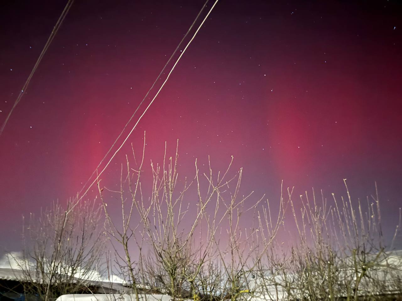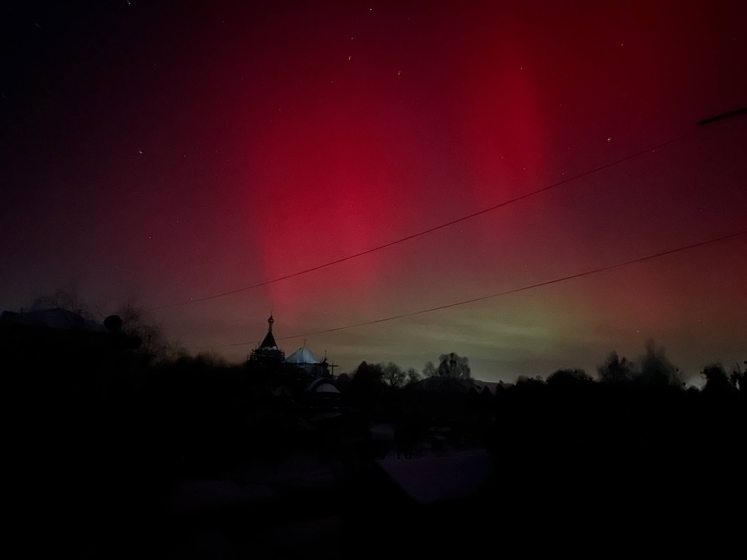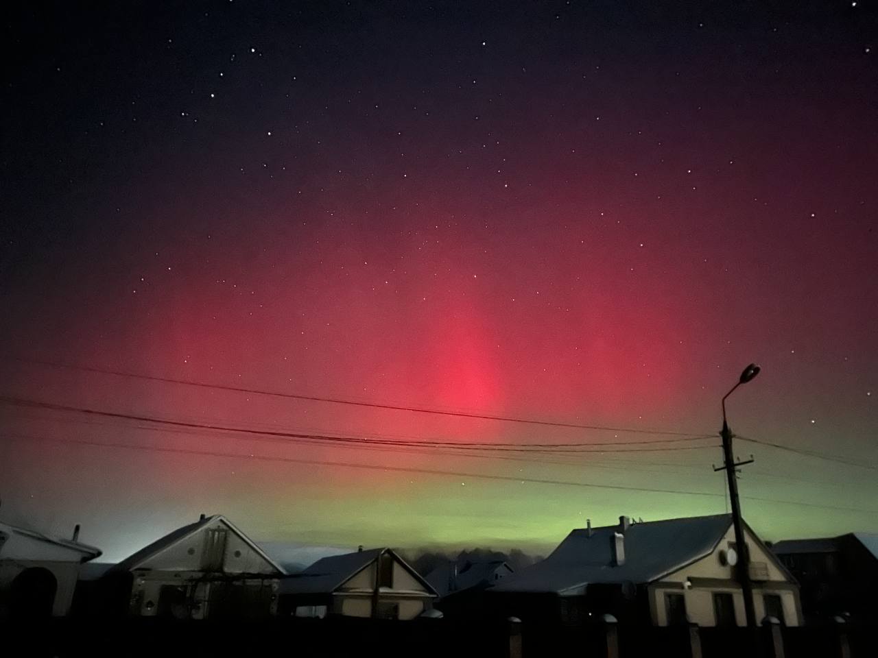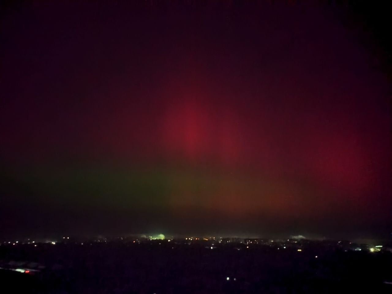 Довідка: Характерний для нашого регіону червонуватий та малиновий колір сяйва виникає через взаємодію сонячного вітру з киснем у верхніх шарах атмосфери (на висоті понад 200 км).