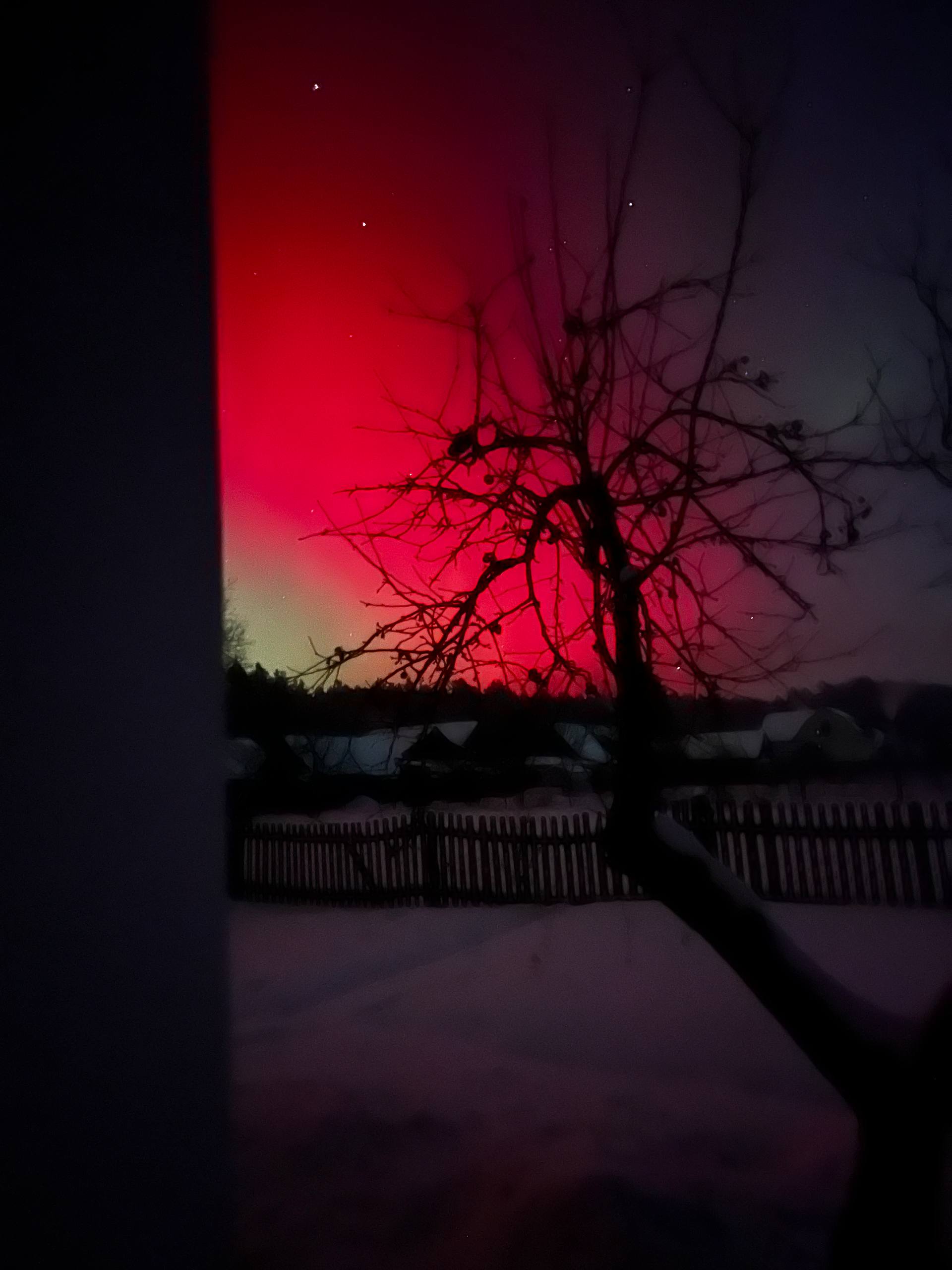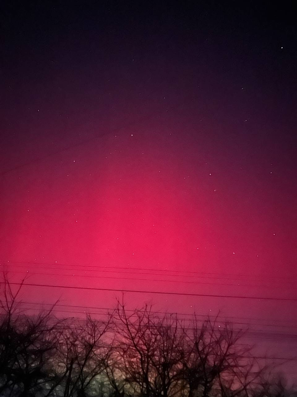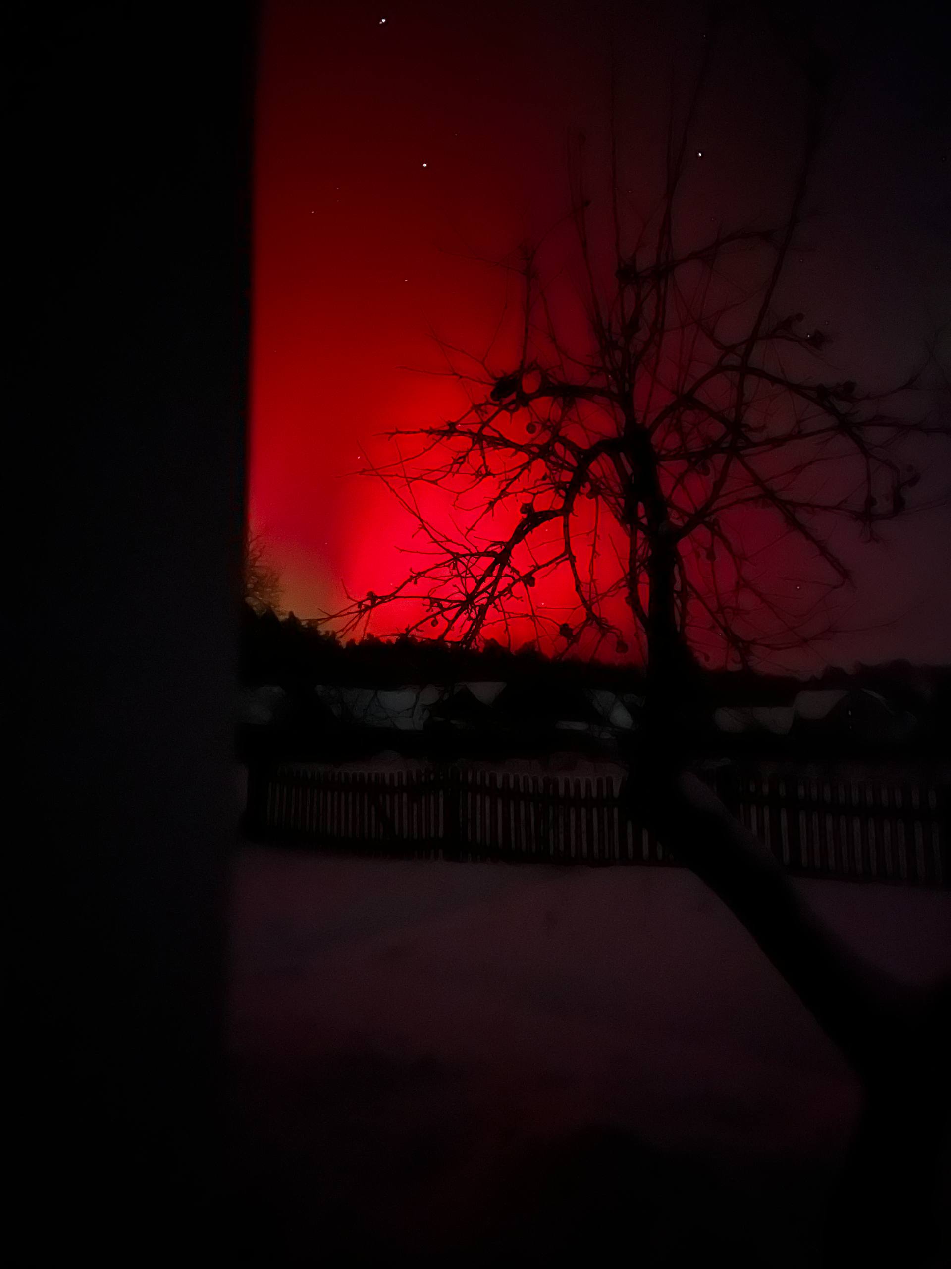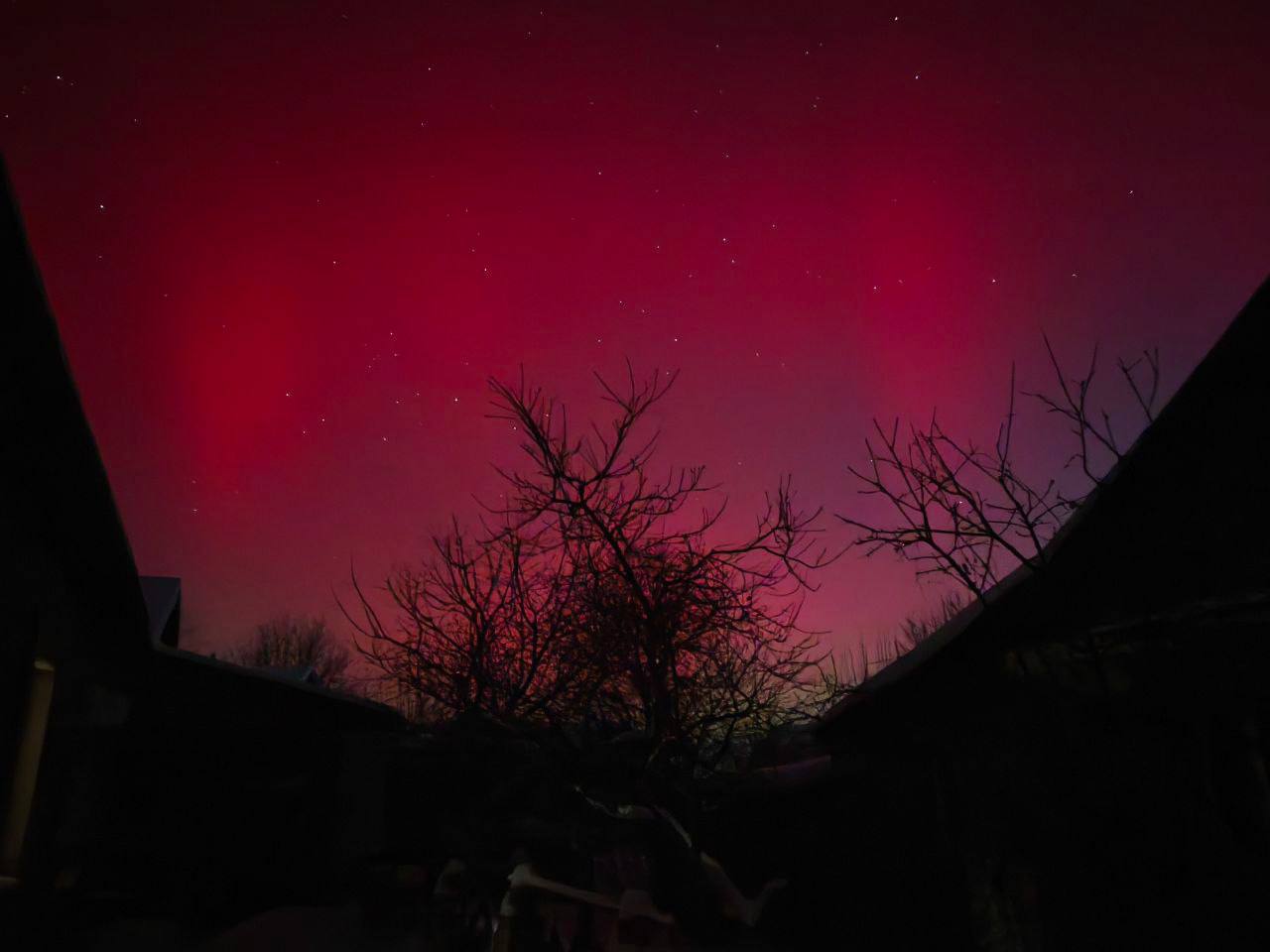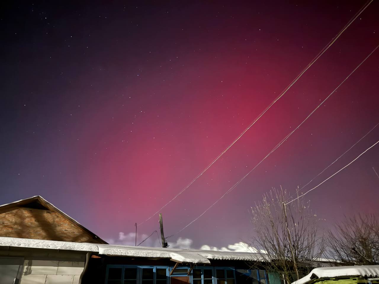 Довідка: Характерний для нашого регіону червонуватий та малиновий колір сяйва виникає через взаємодію сонячного вітру з киснем у верхніх шарах атмосфери (на висоті понад 200 км).