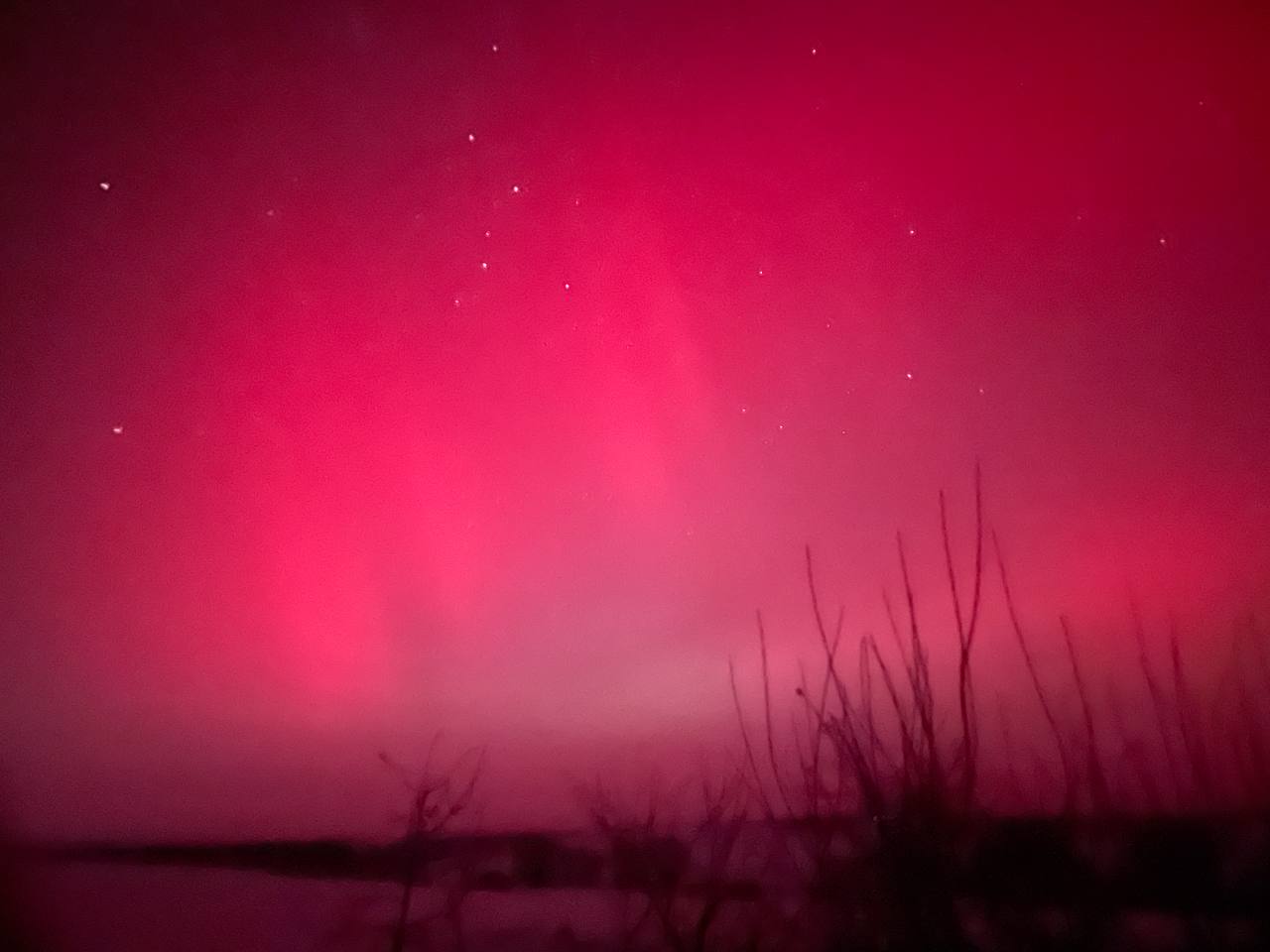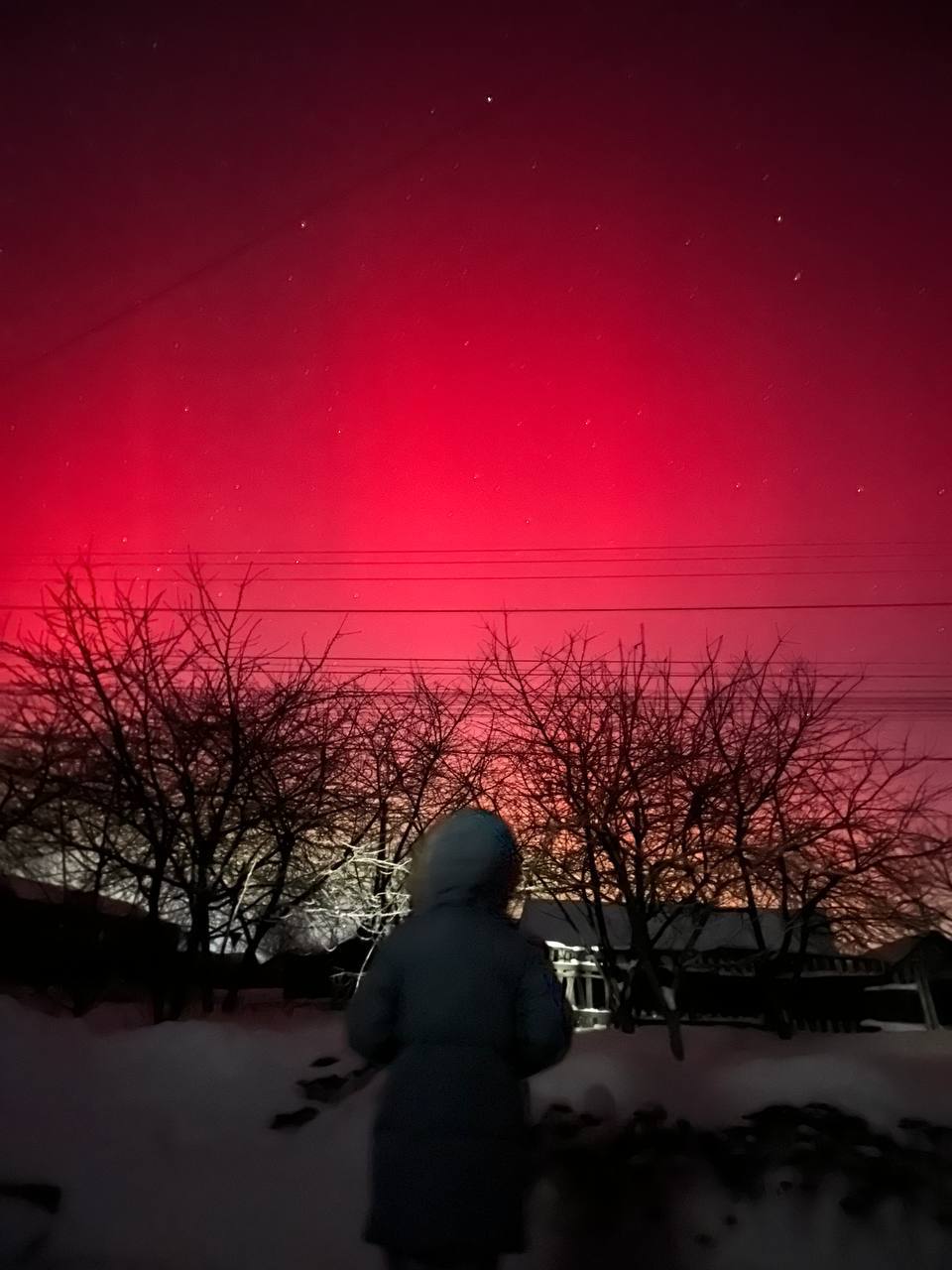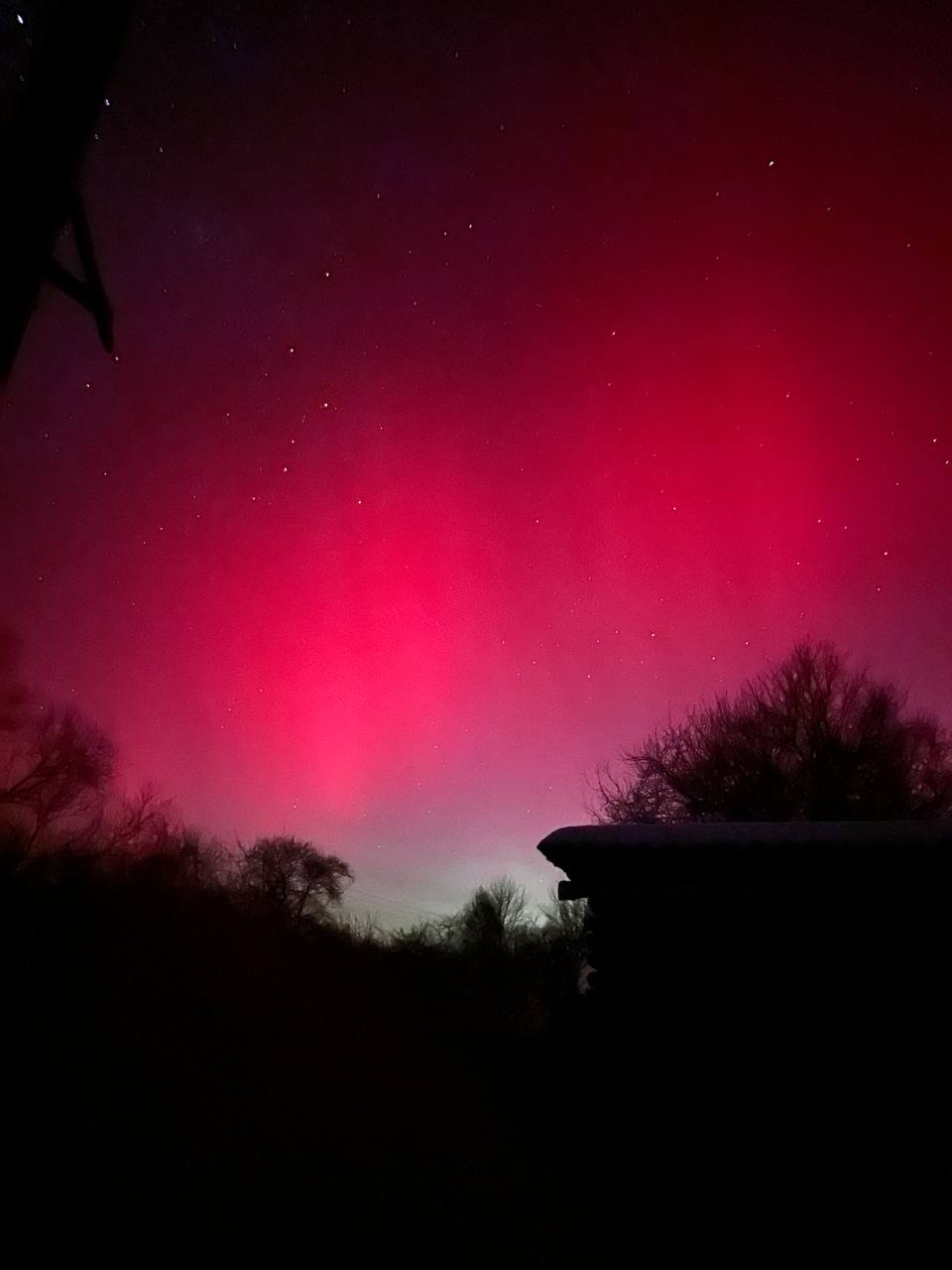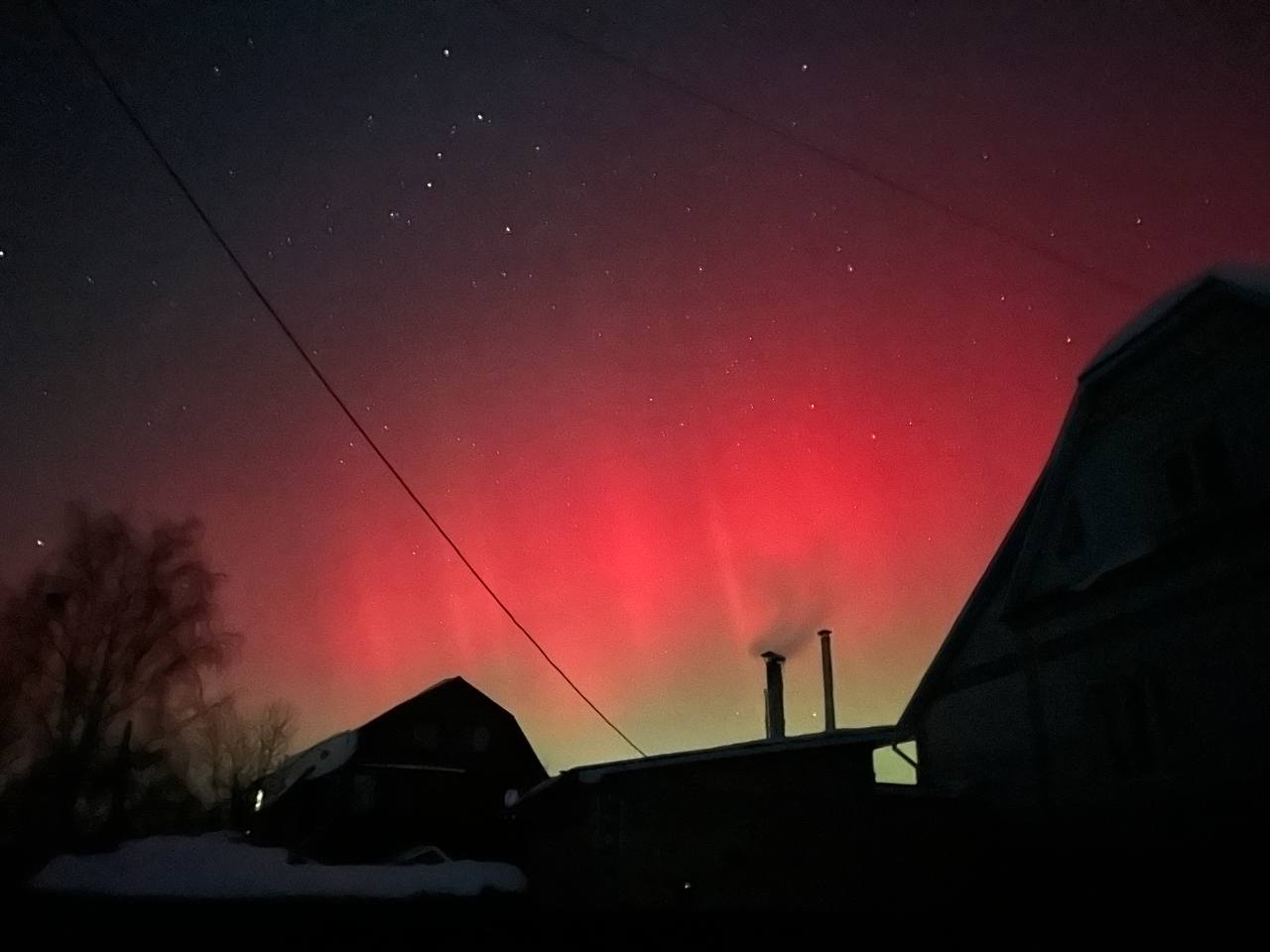 Довідка: Характерний для нашого регіону червонуватий та малиновий колір сяйва виникає через взаємодію сонячного вітру з киснем у верхніх шарах атмосфери (на висоті понад 200 км).